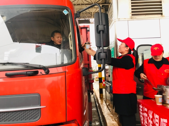 圖為送溫暖活動現(xiàn)場 活動當天,雖然氣溫較低,但在臨海南收費所出口處,身著紅色馬甲的志愿者們頂著嚴寒,依然熱情地為過往司乘人員遞上一杯杯滾燙的姜茶、紅棗茶,并向他們提供問詢、指路、飲水和提示路況信息等便捷服務(wù)。除了設(shè)置志愿者便民服務(wù)臺,臨海南收費所還為過往駕駛員和出行旅客臨時增設(shè)休息室,提供道路溫馨提示服務(wù),同時還在車道配備了飲水機、藥品、修車工具等免費便民物品。