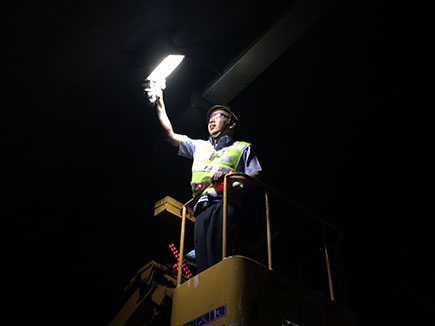 圖為工作人員檢修照明系統線路