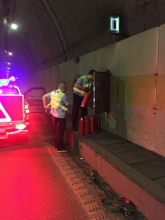 圖為工作人員更換滅火器 因隧道內車輛往來密集,氣體和灰塵難以散發,容易沉積在隧道壁、監控攝像頭及照明燈上形成污漬,此日積月累削弱了隧道內的照明效果,影響駕駛員視線,存在安全隱患。對此,黃土嶺隧道所組織人員對隧道進行清洗和維修保養設備,全面排查各類安全隱患。執勤隊利用登高車逐一清潔寧向左洞內監控攝像頭及照明燈,檢查消防設施狀況,統一對滅火器進行掛牌完善記錄,并協同維養中心檢修溫向隧道照明系統線路,修復損壞的燈具。 經過清洗保養后的黃土嶺隧道,燈光通明,監控清晰,有效地保障了隧道的安全暢通。 毛譯聆