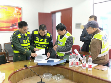 圖為檢查組一行在黃土嶺隧道所檢查消防安全臺賬 在黃土嶺隧道所,檢查組不僅檢查了隧道所安全臺賬和執勤記錄,還對食堂安全進行檢查,發現食堂存在食物留樣盒無日期標識的問題。隨后,檢查組實地進入黃土嶺隧道,發現整條隧道明亮整潔,隧道內火災報警器、消防箱、緊急電話、導向標志等設備設施都完好無損,消防箱內的定期檢查表格還細致地用塑料袋裝起來,有效地避免了污損破壞,值得推廣。只是汽通門無法遠程控制,需要加緊整改。