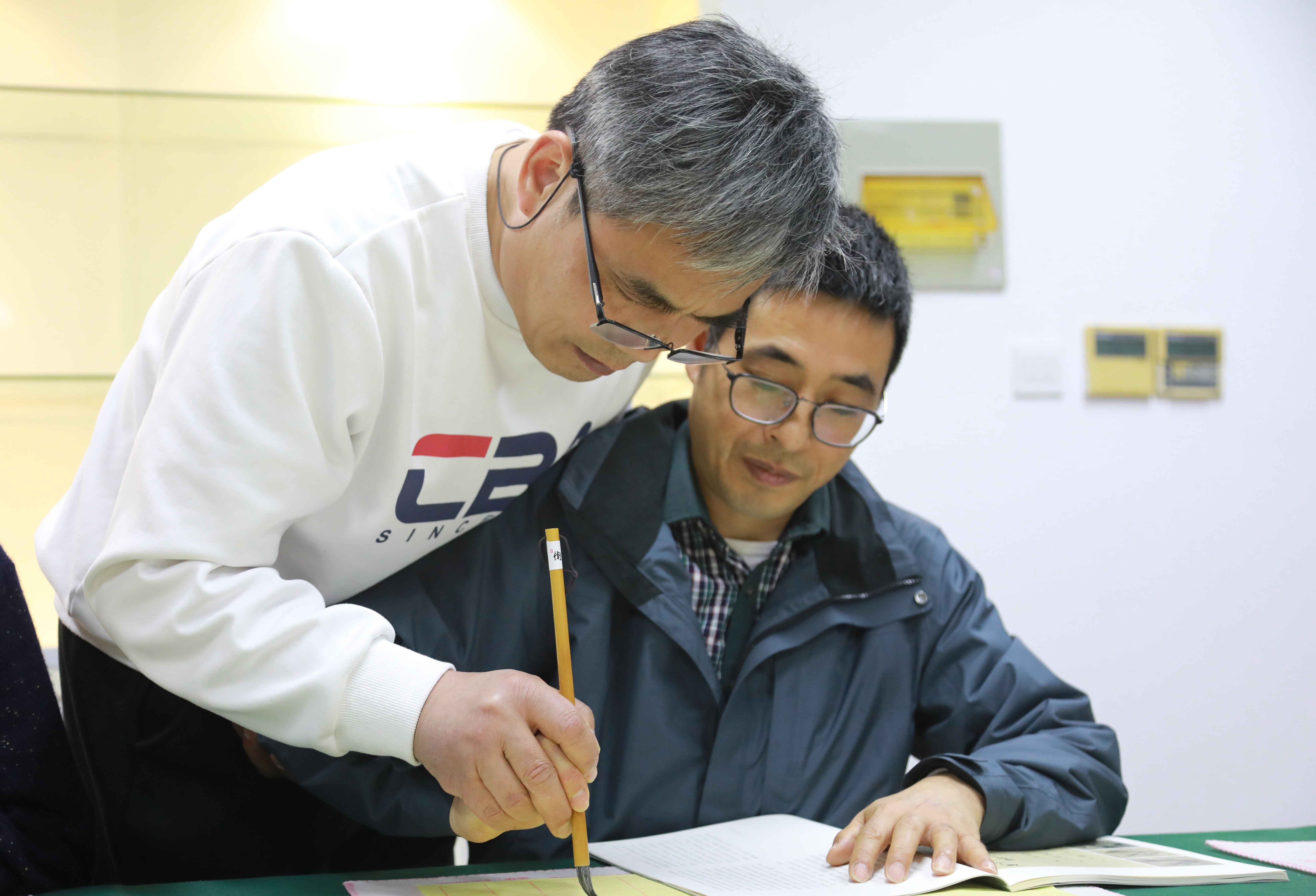 4月13日晚上,公司20樓書法培訓班上,書法興趣小組成員濟濟一堂,一個個正襟危坐,手執(zhí)毛筆,在一張張書法訓練紙上認真地劃著線條,邊上專業(yè)書法培訓教師陳士春一個個輪流手把手教學,幫助大家感受毛筆的運力技巧、筆尖鋪毫要點及筆尖和紙之間的觸感。培訓現(xiàn)場氣氛濃厚,老師用心講課,既有理論解讀,又有實踐指導,學員們用心領悟,認真練習,現(xiàn)場呈現(xiàn)出教學相長的良好氛圍。