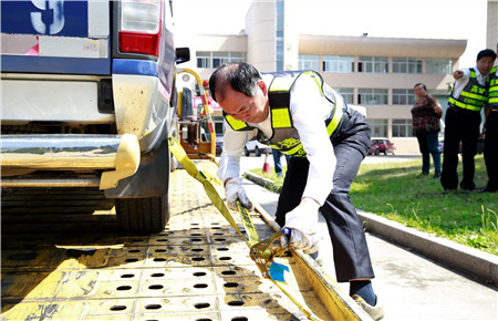 當(dāng)哨聲響起時(shí),清障作業(yè)的考試開(kāi)始了。就象聽(tīng)到路上事故的指令,選手們飛快躍上清障車,趕到“現(xiàn)場(chǎng)”,一組兩名員工,一名快速擺放隔離筒進(jìn)行預(yù)警,一名趕到“事故車”前進(jìn)行背拖拖曳作業(yè),綁帶作業(yè)、固定輪胎,甚至警燈、檔位、手剎、安全帶、巡視事故車等細(xì)節(jié)也有具體要求,雖然上午天氣涼爽,可因?yàn)楸荣惖乃俣缺绕磁c現(xiàn)場(chǎng)緊張的氣氛,選手們額頭都冒出了熱氣。