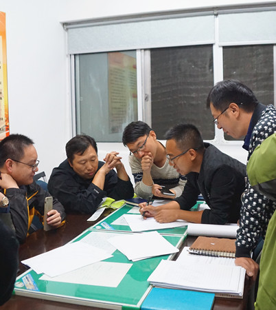 圖為楊金梁和工地隊(duì)員檢查施工機(jī)械設(shè)備