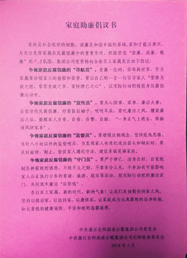 為充分發揮員工家庭成員在黨風廉政建設中監督預防的特殊作用,根據集團“廉政教育月”活動要求,5月30日,監察室向全體員工發放了一封以“傳承好家風,共建廉之家”為內容的《家庭助廉倡議書》,讓廉潔文化走進家庭,成為家庭美德,更好地發揮家庭成員在廉政建設中的特色作用。