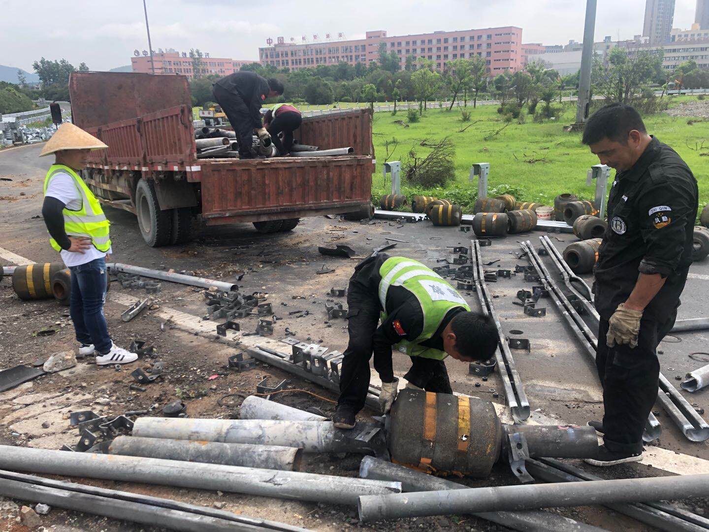 圖為廢舊物資處置現(xiàn)場(chǎng) 一大早,小組成員直接抵達(dá)事故現(xiàn)場(chǎng),戴上安全帽、穿上反光背心,伴隨著“轟隆隆”的打樁聲,大家穿過臨時(shí)為高架橋斷層搭建的鐵梯,從布滿碎石的緩坡爬上施工區(qū)。此時(shí)挖掘機(jī)、裝載機(jī)等不停作業(yè),現(xiàn)場(chǎng)灰塵彌漫,環(huán)境惡劣,大家冒著酷暑一直守在現(xiàn)場(chǎng)監(jiān)督,對(duì)廢舊物資進(jìn)行分類,逐一清點(diǎn),嚴(yán)把廢舊物資處置關(guān)。