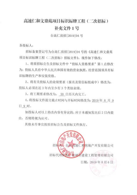 高速仁和文鼎苑項目標(biāo)識標(biāo)牌工程(二次招標(biāo))補(bǔ)充文件1號