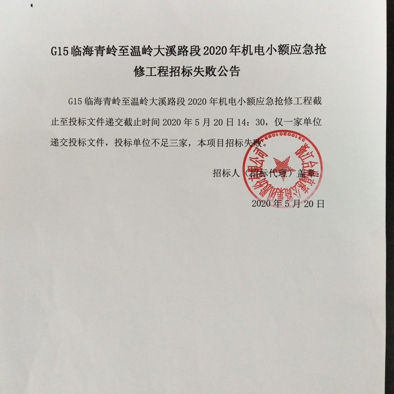G15臨海青嶺至溫嶺大溪路段2020年機(jī)電小額應(yīng)急搶修工程招標(biāo)失敗公告