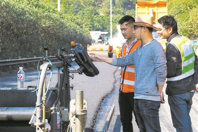 “路面銑刨時有時會出現銑刨不完全存在夾層的現象,如不清理干凈則會嚴重影響攤鋪后路面的平整度?!睏罱鹆航榻B道,所以攤鋪時每道工序,他都時刻緊盯,確保攤鋪的路面不存在任何瑕疵。