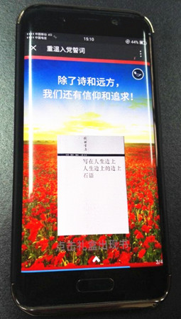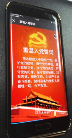 “凝視黨旗,我把奉獻(xiàn)刻心里;舉起右拳,我把責(zé)任刻心里;宣讀誓言見證我對黨的忠誠;這崇高的選擇是我終身的信仰----”點(diǎn)開微信圖文信息,伴隨著低沉渾厚的男聲詩朗誦,接收到信息的黨員們不由肅然起敬,仿佛置身當(dāng)年黨旗下宣誓的莊嚴(yán)時(shí)刻。