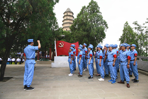 圖為黨員在梁家河合影 不顧前一天的舟車勞頓,第二天一大早,黨員們整裝出發(fā),在紅色旗幟引領下,頂著烈日,一路步行到達寶塔山山頂。“手抓黃土我不放,緊緊兒貼在心窩上。幾回回夢里回延安,雙手摟定寶塔山?!本C合支部的小周對著寶塔山,情不自禁地大聲誦讀起賀敬之的《回延安》。黨員們在巍巍寶塔下高舉右拳,用鏗鏘有力的聲音宣讀了入黨誓詞,對于大家來說,重溫入黨誓詞是共產(chǎn)黨員表達自己為共產(chǎn)主義奮斗終生的最佳方式,黨員們的心靈再次受到震撼和洗禮。